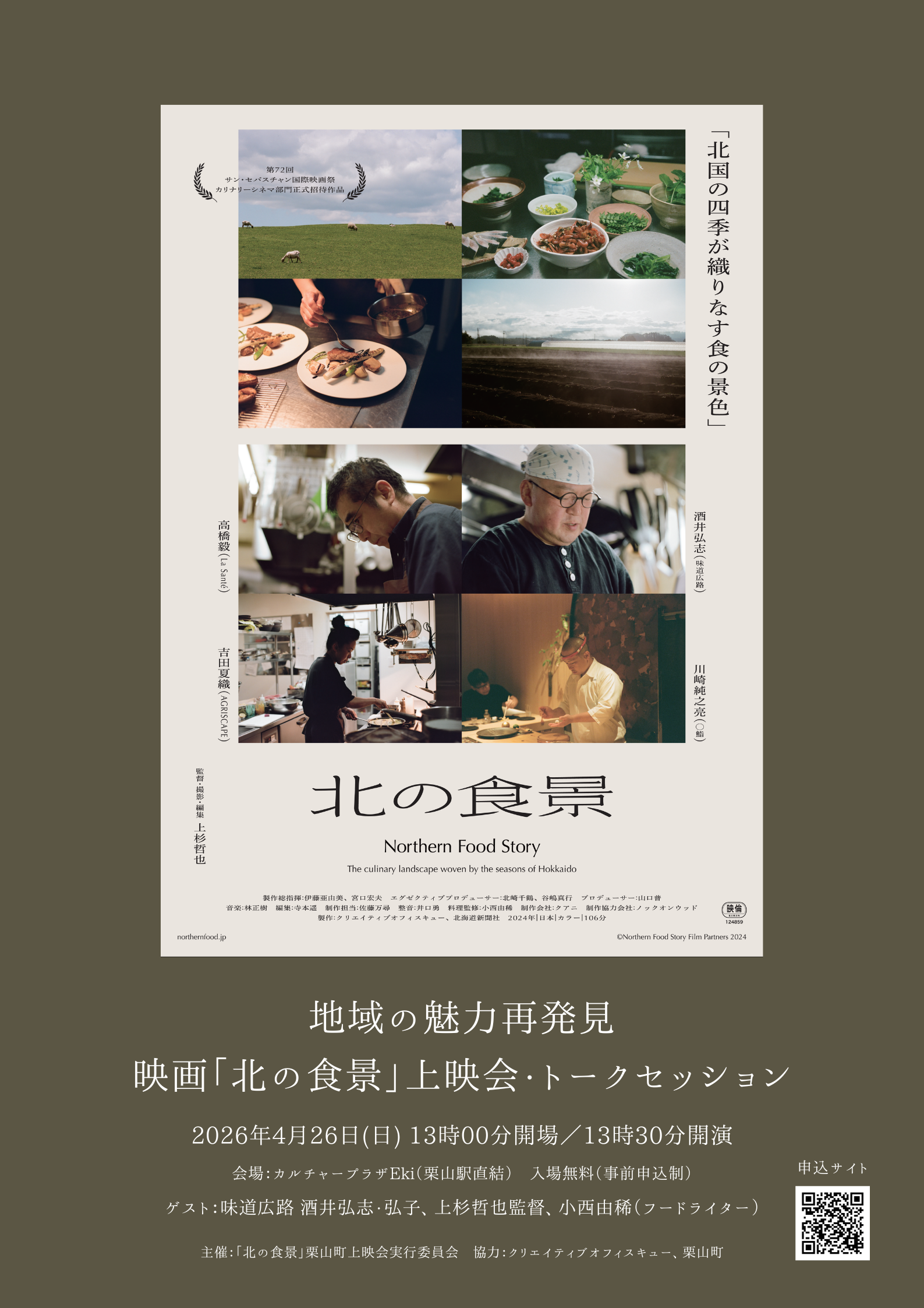 ▼主 催: 「北の食景」栗山町上映会実行委員会(実行委員長 早乙女 充(料理と、借景。サメオト))